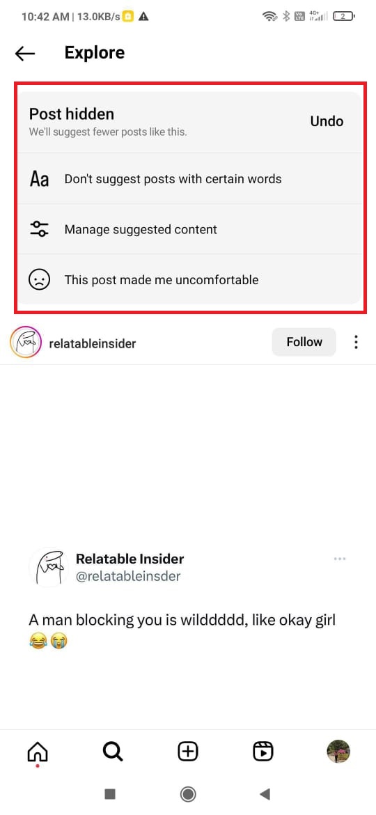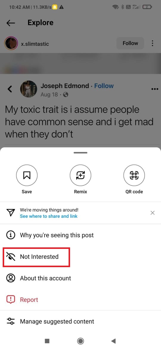 When you select this option on a post, you’re informing Instagram’s algorithm that you’re not interested in that type of content, allowing the app to refine what it shows you in the future.